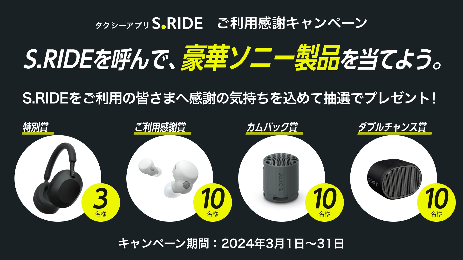 3月1日(金)より、「S.RIDE」ご利用者への日頃の感謝の気持ちを込め、豪華ソニー製品が当たるプレゼントキャンペーンを実施します。キャンペーン期間中、「S.RIDE」のご利用状況により、ソニー製ヘッドホンやスピーカーを抽選でプレゼントします。また、ダブルチャンス賞として空車のタクシーが通過する場所を教えてくれる新機能「バーチャルタクシースポット」のスポットを評価して頂いた方にも抽選でプレゼントを用意しています。