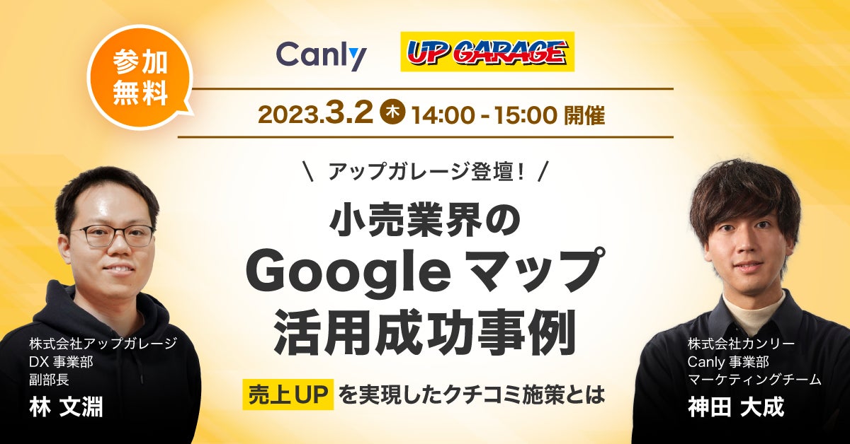 Googleビジネスプロフィール(旧・Googleマイビジネス)・HP・各SNSの一括管理サービス「Canly(カンリー)」の開発・提供を行う株式会社カンリー(所在地:東京都渋谷区、代表取締役:辰巳 衛,秋山 祐太朗)は、無料ウェビナー『アップガレージ登壇!小売業界のGoogleマップ活用成功事例〜売上アップを実現したクチコミ施策とは〜』を3/2に開催します。