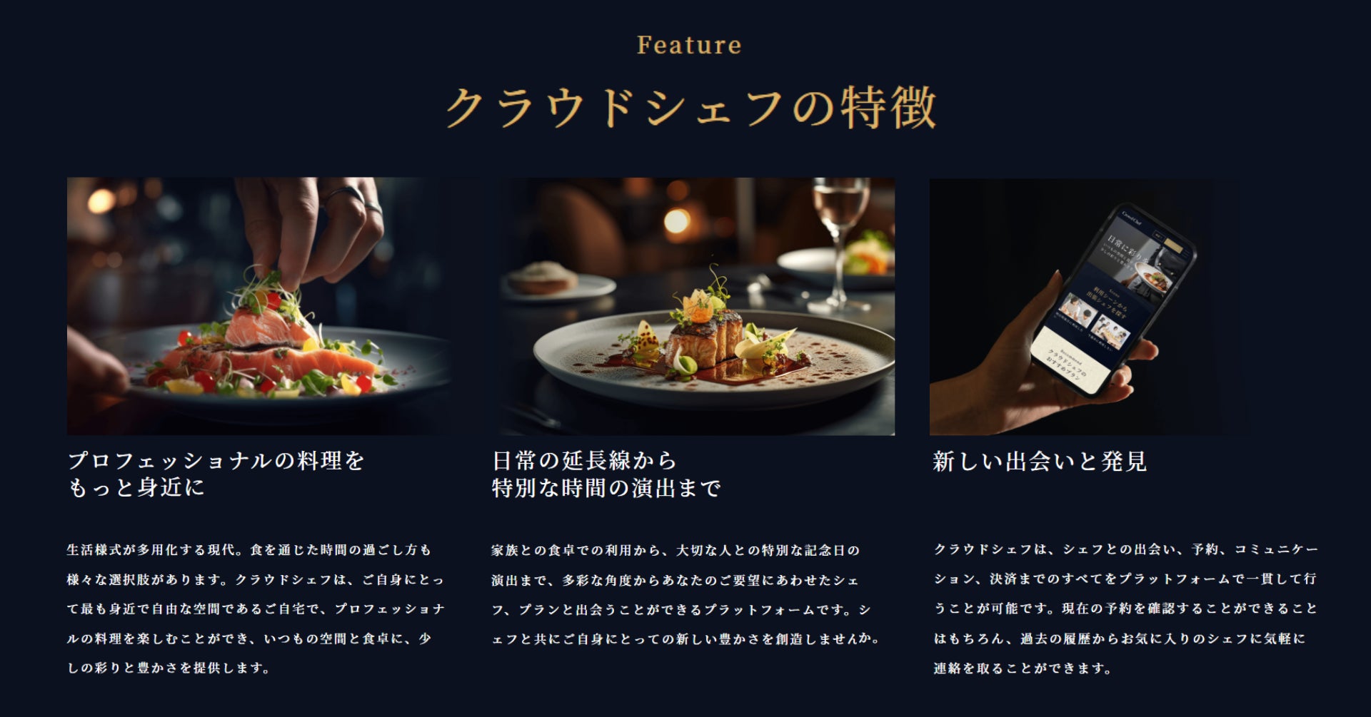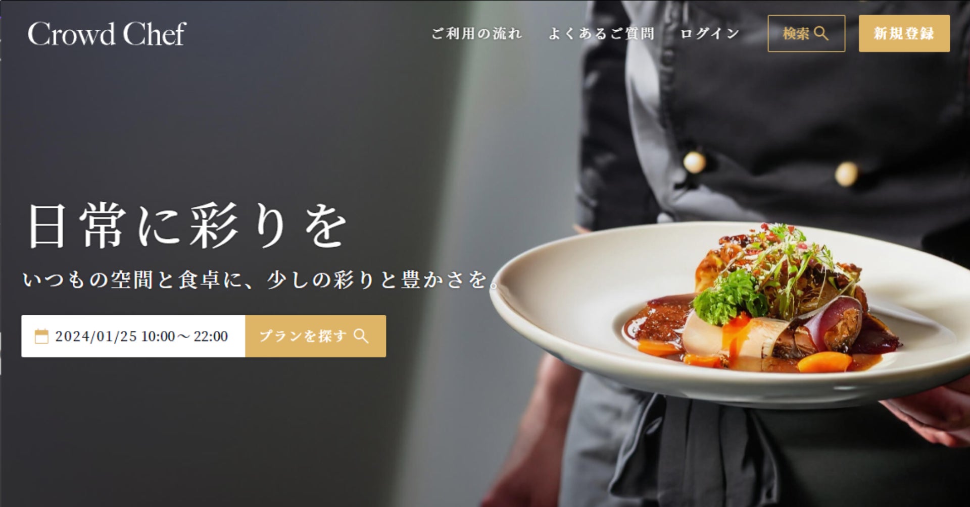 プロのシェフと一般のご家庭のマッチングサイトです。サイト上でシェフ一覧、シェフのおすすめプラン、利用シーンから利用者は商品を選択することが可能です。ご家庭や自身の事情で外食が難しい方などが特別な日の演出のため、日常の作り置きの料理、大人数で集まる際のケータリングなど、料理のジャンル・シーンを問わずご利用いただけます。