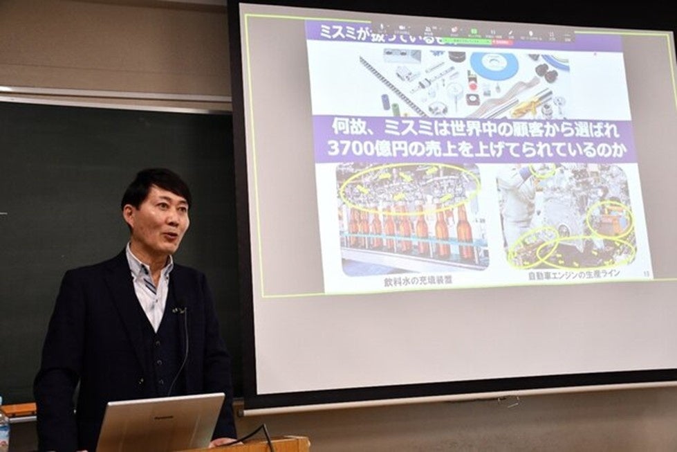 今回の授業には、茨城大学の1年生を中心に約150名が出席しました。「企業は社会へどのような価値を提供しているか」に焦点を当てた講義では、ミスミのビジネスや社会への提供価値について、「時間」にこだわり、工場などの自動化設備に使用する機械加工部品の製造・販売を通じて「顧客時間価値」を社会に提供していると説明、「確実短納期」と「顧客の工数削減」を実現する生産や流通の仕組み、デジタルものづくりへの取り組みについて紹介しました。
