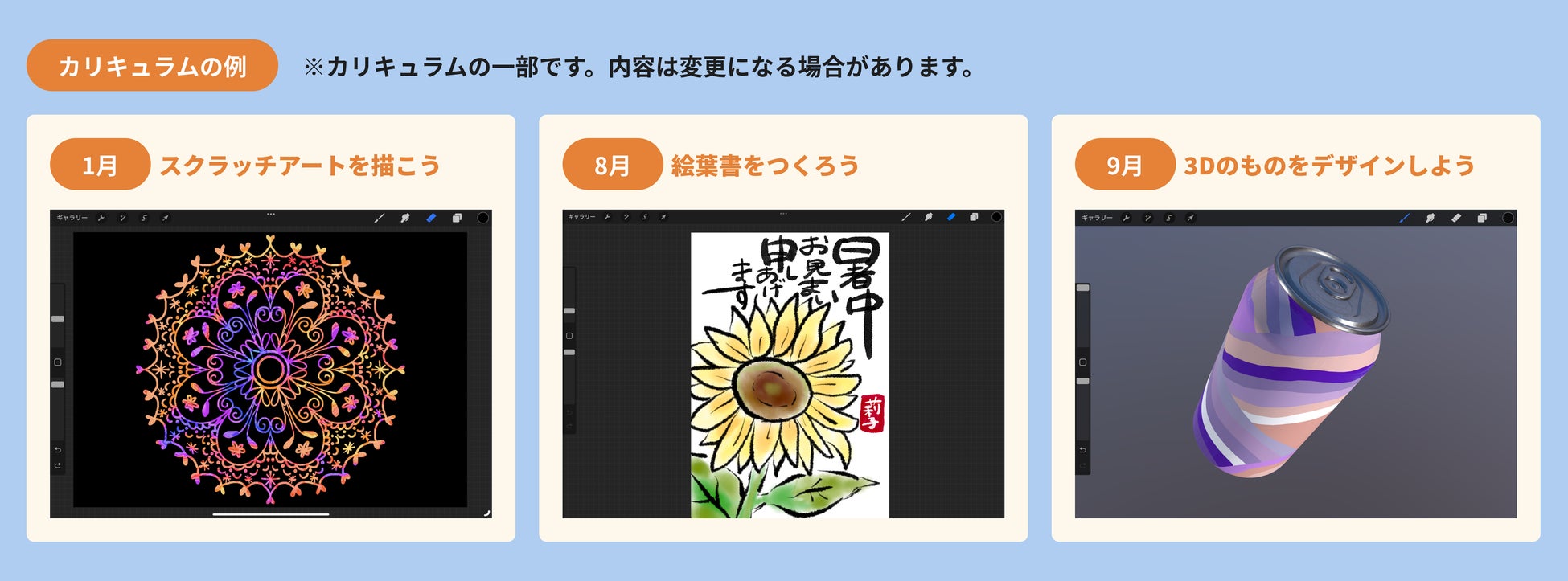 絵画やイラストをはじめとして、デジタルならではの動くアニメーションや立体的な3Dアートにも挑戦することができ、初心者でも楽しみながら本格的なアートスキルを身につけることができます。また、毎月違ったカリキュラムをご用意しておりますので、飽きることなく幅広く学んでいただけます。