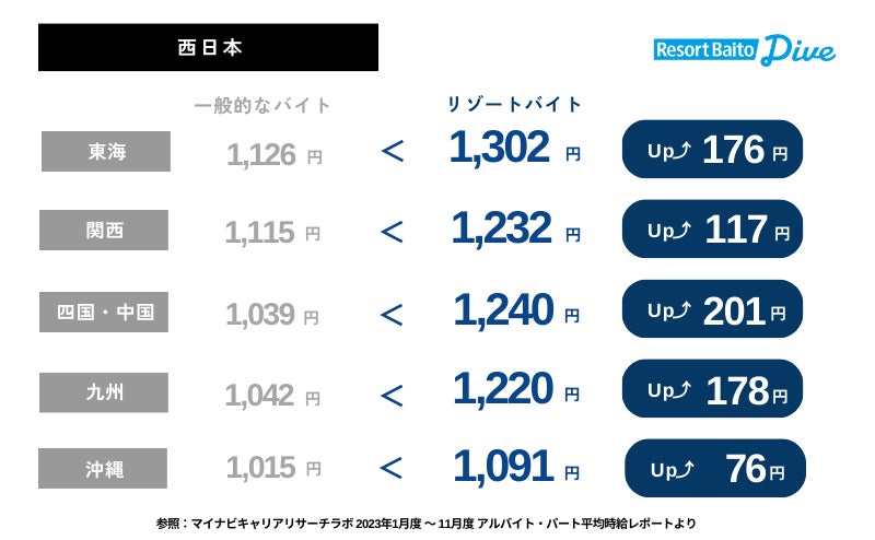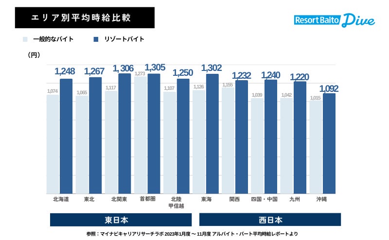 「一般的なバイト」と「リゾートバイト」のエリア別平均時給を比較すると、すべてのエリアで「リゾートバイト」の時給が高いことがわかりました。(*4)
