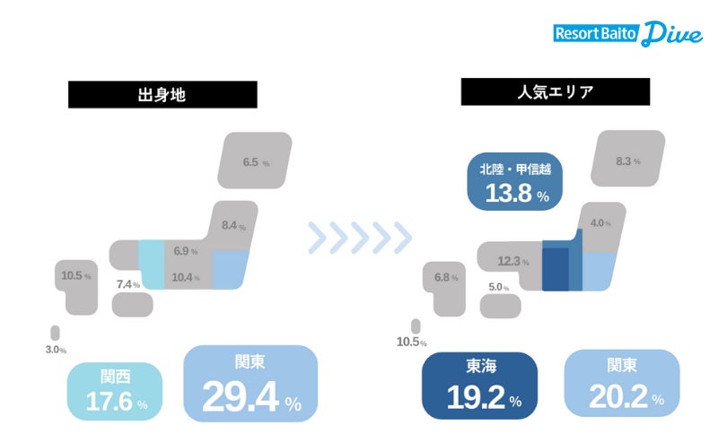 リゾートバイトの就業者の出身地について調査したところ、最も多いエリアは関東(29.4%)、次いで関西(17.6%)と関東・関西エリアが全体の約5割を占めております。