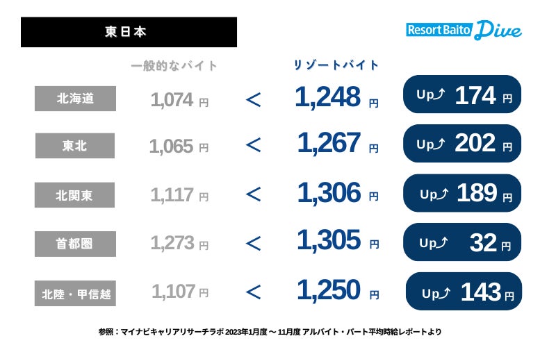 一方で「リゾートバイト」の最も時給が高いエリアは、北関東(1,306円)、次いで首都圏(1,305円)、東海(1,302円)と賃金格差が小さく首都圏と他方の差がほとんどないと言えそうです。