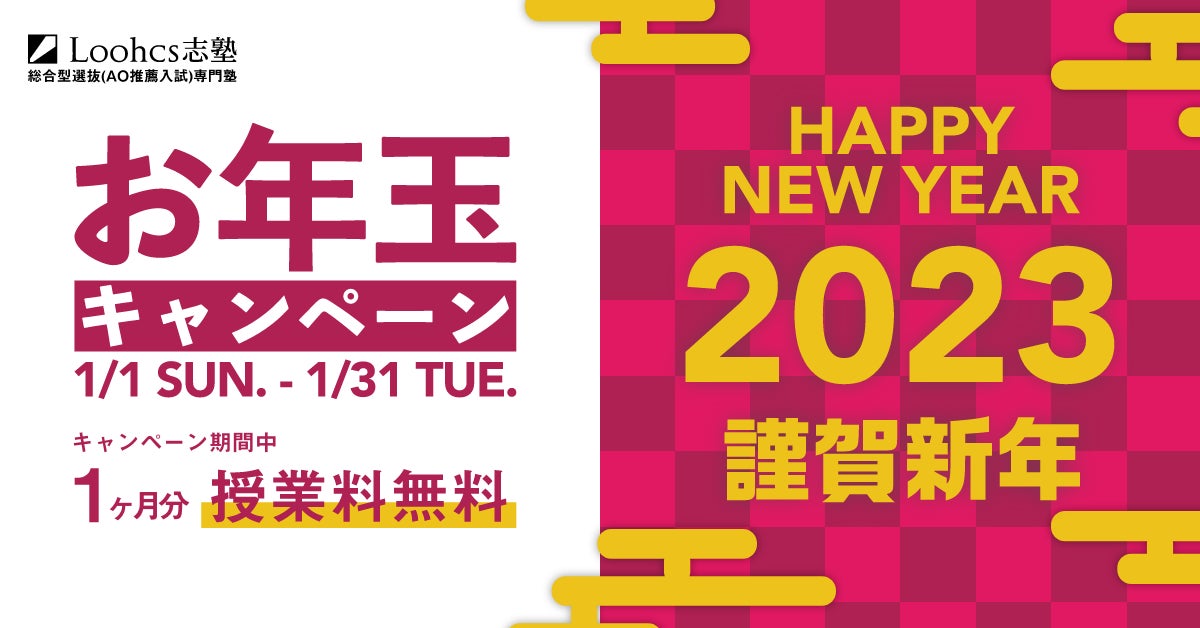 Loohcs株式会社(代表取締役 : 斎木陽平 本社所在地 : 渋谷区代々木)は、同社運営のAO入試専門の学習塾「ルークス志塾」にて「【授業1ヶ月無料】お年玉キャンペーン!」を実施します。