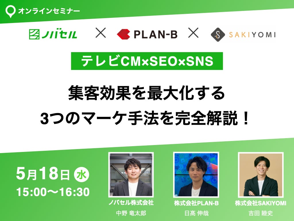 【テレビCM×SEO×SNS】 集客効果を最大化する3つのマーケ手法を完全解説!~ノバセル×SAKIYOMI×PLAN-B共催~