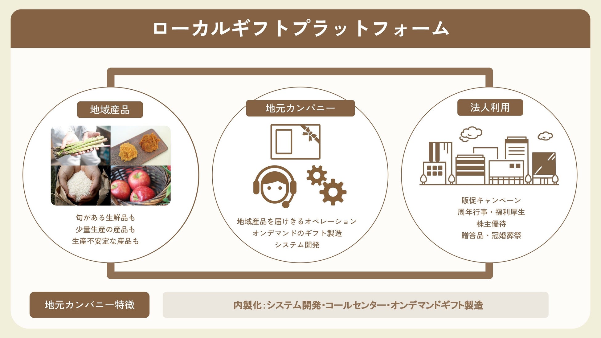 地元カンパニーは日本各地の地域ならではの産品や旬の生鮮品がラインナップされたご当地カタログギフト「地元のギフト」の運営や自社カタログギフト管理システムを活用したカタログギフトの運営サポートを行う信州発スタートアップ企業です。「地元のギフト」は全国約1300種類の商品の中から地域ごと、テーマごとにラインナップされたカタログギフトやPBギフトのOEM提供を扱っている点が特長です。各種キャンペーンや景品、福利厚生等で約3,000社以上の企業にご利用いただいています。