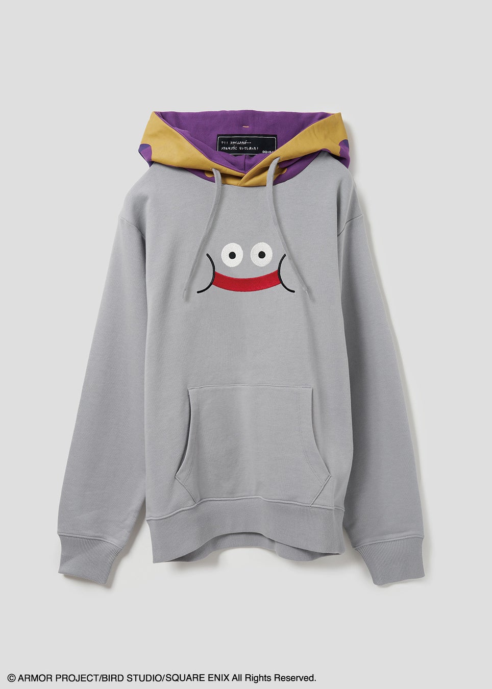 メタルキングになれちゃうパーカー。胸元にはメタルキングの顔、フードには王冠がデザインされており、フードをかぶるとメタルキングになっちゃいます。ポケットの中には、メタルスライムが8匹隠れています。フードの内側にはメッセージウィンドウがデザインされています。