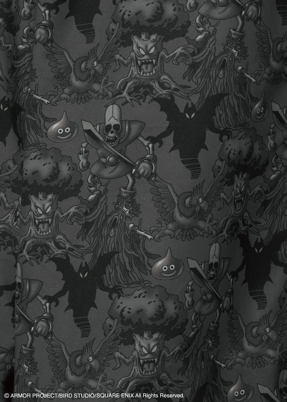 ダークなモンスターのリバーシブルブルゾン。ようすをうかがっているシャドーが胸元に刺繍されたシンプルに着こなせるデザイン。面をひっくり返すと、ダークカラーのモンスターたち(スライムダーク、かげのきし、シャドー、まかいじゅ、あんこくちょう、ヘドロイド)の総柄があわらわれます。