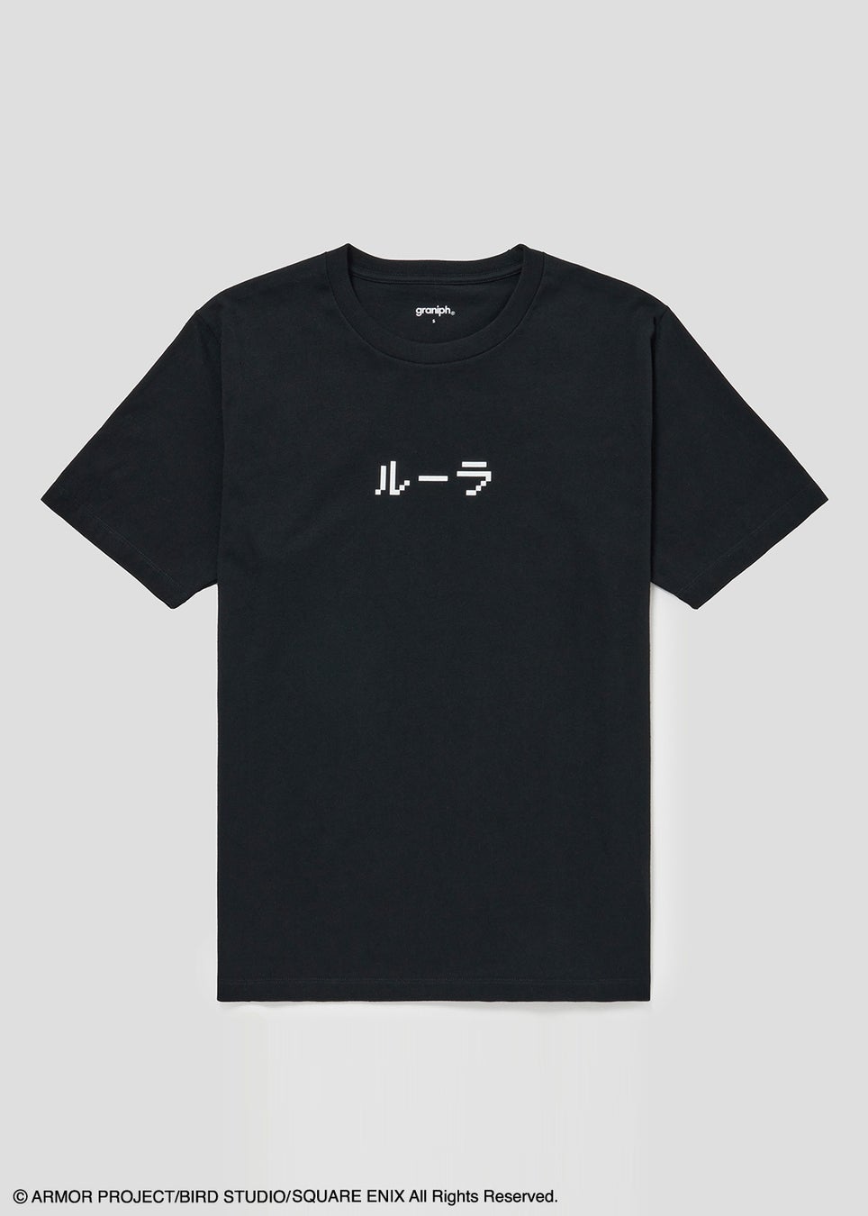 ルーラをとなえられるTシャツ。一瞬で移動できるじゅもん「ルーラ」の文字を胸元に「ドット文字」でデザイン。背面にはルーラをとなえたものの、室内であったため、天井に頭をぶつけてしまったスライムと、メッセージウィンドウで「ルーラを となえた!てんじょうに あたまをぶつけた!」がデザインされています。