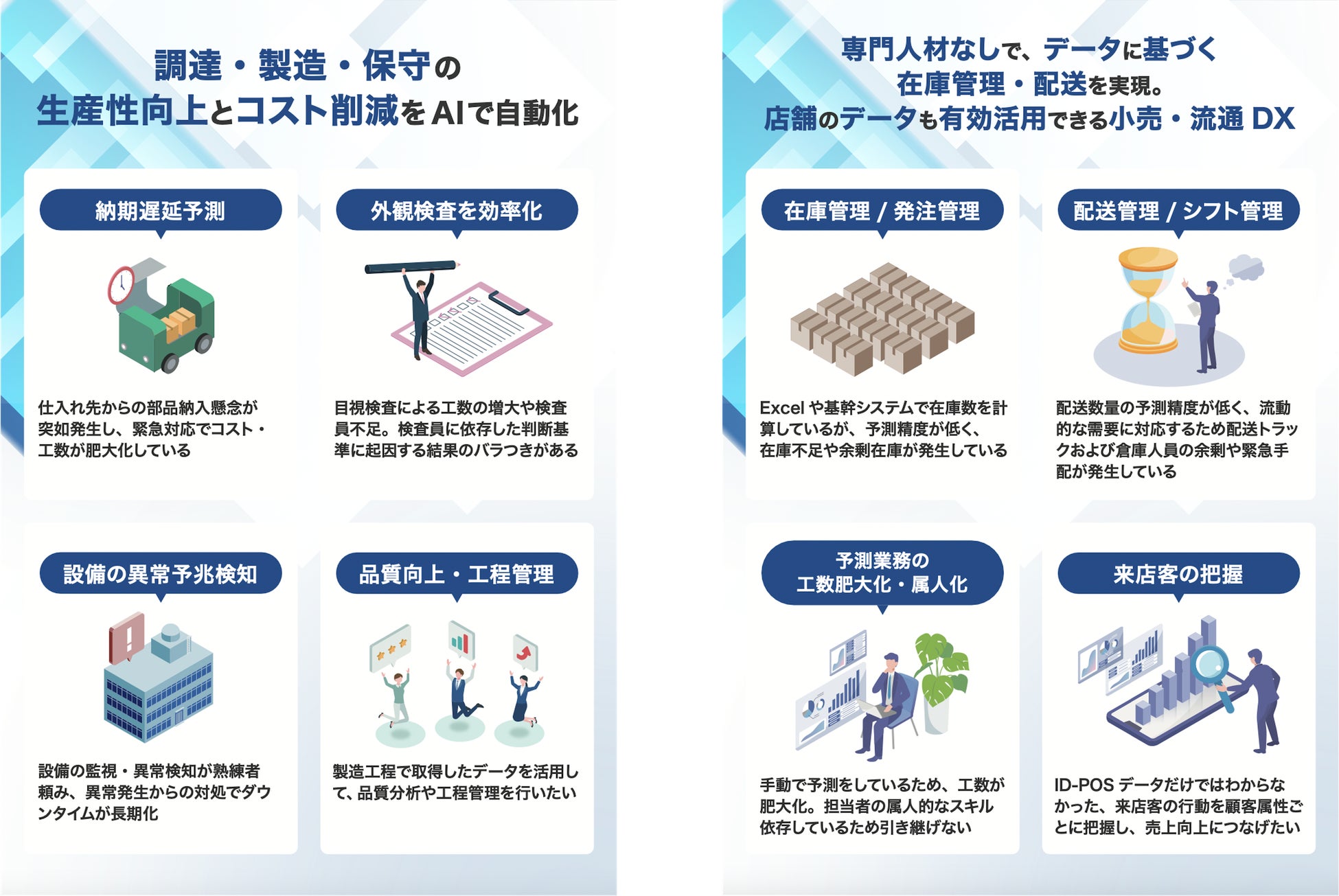 最新のAI/機械学習の技術を、業務利用するためのアイデアを業界別にご提案します