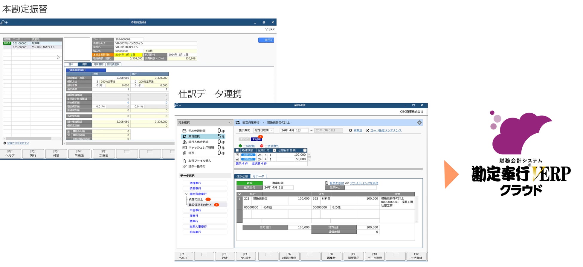 『勘定奉行V ERPクラウド』と一緒に利用することで、建設仮勘定の計上や費用振替、本勘定振替を行ったタイミングで仕訳が自動作成されるため、複雑な建設仮勘定仕訳の入力業務が一切不要となります。