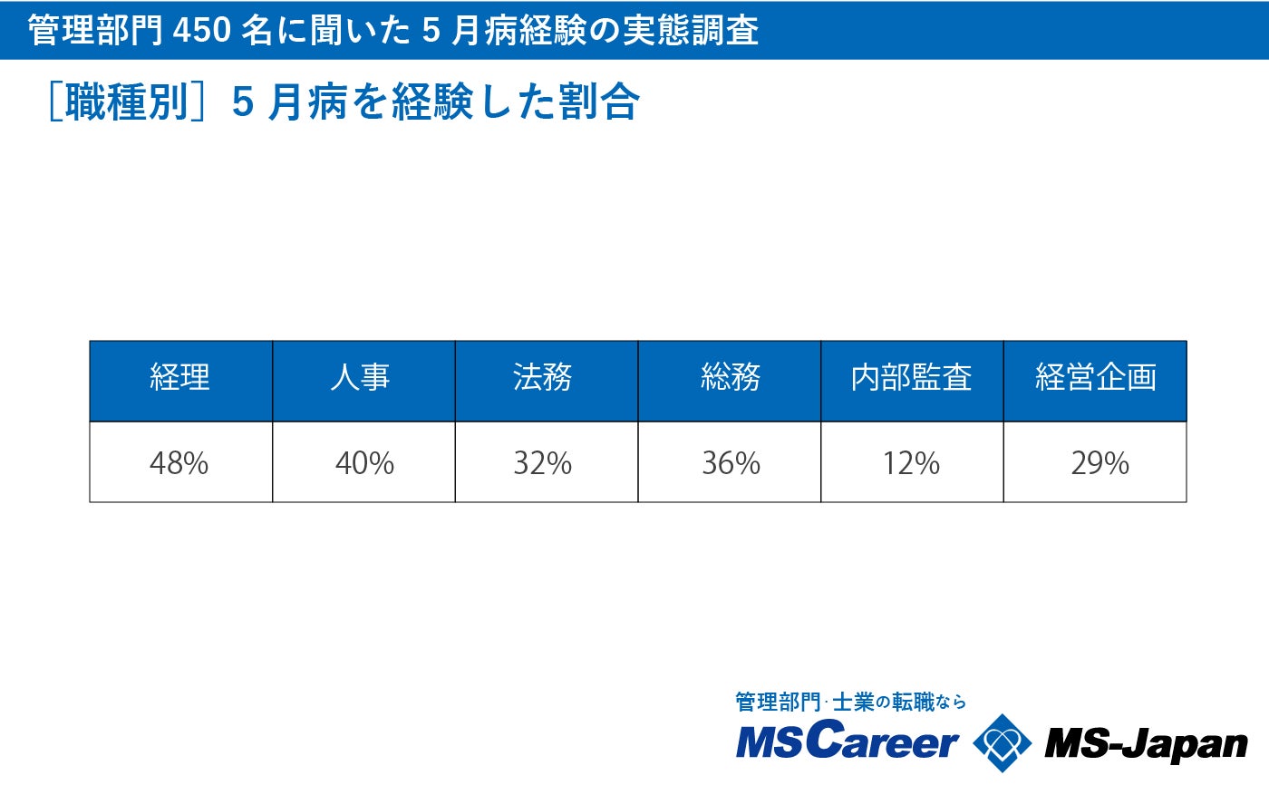 また同設問の回答を職種ごとにみた結果では、5月病を経験した割合が最も高かった職種は経理で48%、一方最も低い職種が内部監査で12%でした。