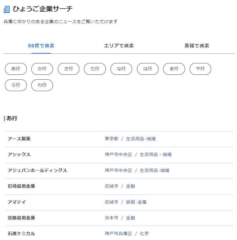 今回のリニューアルの目玉と言えるのが、「ひょうご企業サーチ」です。兵庫県内の上場企業111社をはじめ、約190の企業・団体の個別ページが設けられ、業種やエリアでも検索が可能。各社の企業データや最新の関連ニュースが一覧で表示されます。2月26日時点ですでに約3000本の関連ニュースが登録されており、これからも日々新たな情報が加わっていきます。