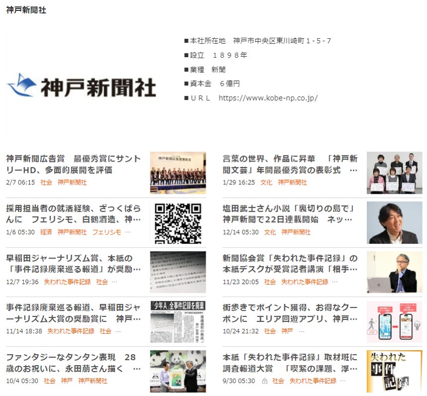 兵庫県で唯一の地元紙「神戸新聞」を発行し、電子版「神戸新聞NEXT」でも日々のニュースをお伝えしています。新聞社ならではの情報発信力やネットワーク力を生かし、読者、兵庫県民の皆さまと一緒に地域課題の解決に取り組んでいきます。1898年の創刊から変わらず地域の皆さまが知りたい情報をお届けしてきました。「私たちは公正に伝え、人をつなぎ、くらしの充実と地域の発展につくす」をモットーに、これからも皆さまと成長する新聞でありたいと考えています。
