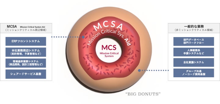 ドリーム・アーツの掲げる「ミッションクリティカル領域のシステム(MCS)を支える」というコンセプトのこと。Support(サポート)ではなくAid(エイド)という表現を使用している理由は、Aidという言葉が「困難な状況にある人や組織を実践的に助ける」という意味を含むためであり、「BD(ビッグドーナツ)領域の業務デジタル化」に取り組む姿勢を示しています。 MCSは、企業や組織の存続に欠かせない業務を遂行するうえで重大なシステムです。 財務会計システム、人事労務システムなどが業種を問わず該当しますが、業種特有のMCAには金融機関の勘定系システム、製造業の生産管理システム、鉄道会社の運行管理システムなども挙げられます。MCSAの代表例にはこれらMCSを支える、ERPフロントシステムや契約管理業務や、現場期間業務システムとして工程管理システムなどが該当します。