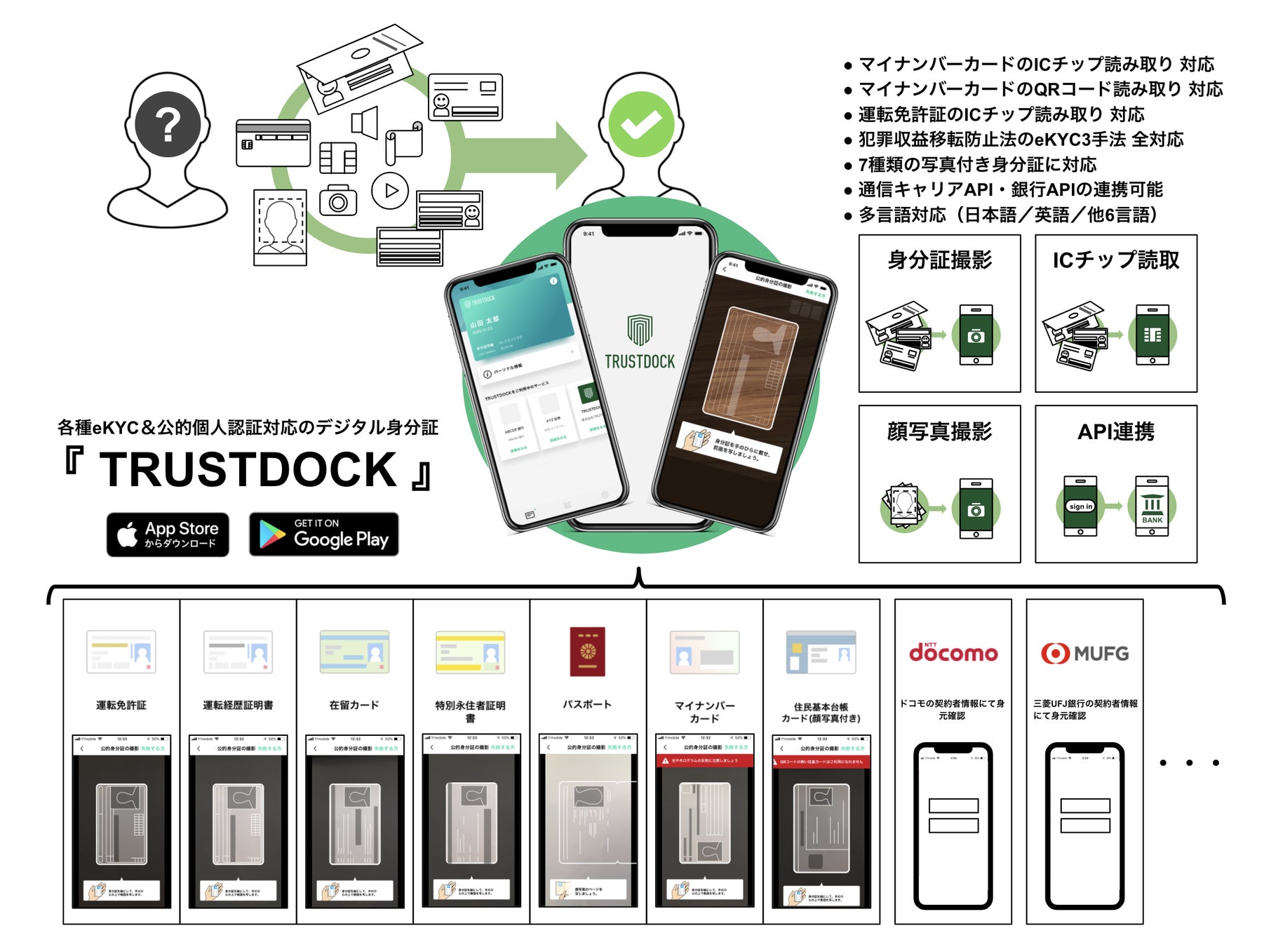 マイナンバーカードや運転免許証のICチップ読み取りをはじめ、各種のeKYCにも対応したデジタル身分証アプリ「TRUSTDOCK」では、今後もマイナンバーカードを活用した本人確認や電子署名、マイナンバーの取得など、マイナンバーカードの民間利用のユースケース拡大に貢献しつつ、デジタル社会の実現に向け、様々な事業者との連携を強化していきます。