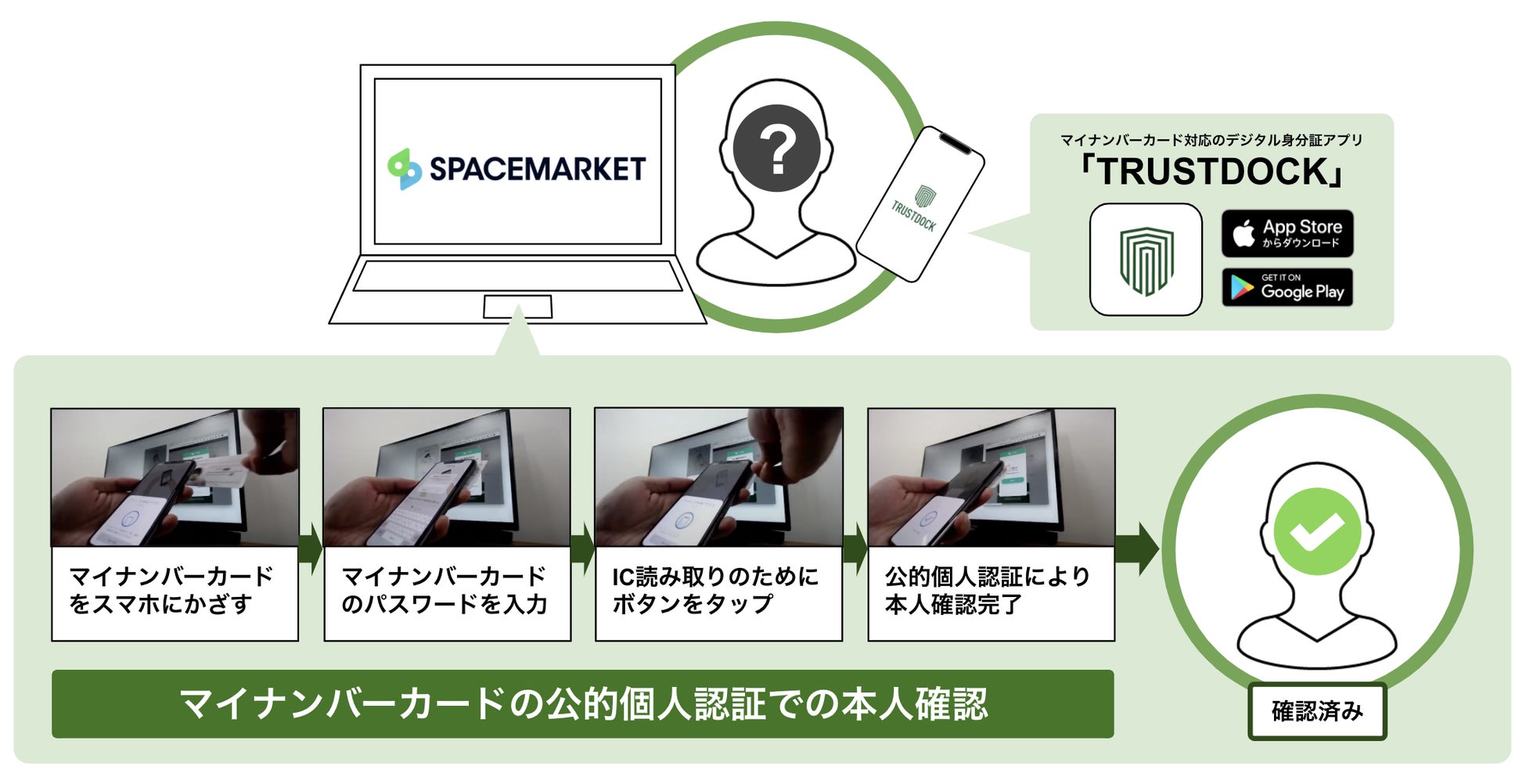 この度、スペースマーケットは、利用者の一層の安心・安全を確保するため、「TRUSTDOCK」アプリでのマイナンバーカードのICチップ読取による公的個人認証を本格導入いたしました。
