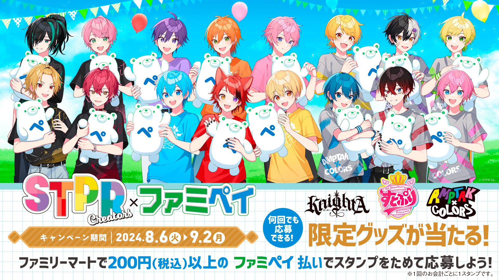 株式会社STPR(本社:東京都渋谷区、代表取締役社長:柏原真人)は、ファミマのアプリ「ファミペイ」(以下:「ファミペイ」)の5周年を記念したファミペイとのキャンペーンとして、STPRでは初となる所属グループ3組『すとぷり・Knight A - 騎士A -・AMPTAKxCOLORS』合同でのコラボキャンペーン「STPR Creators×ファミペイ」を、2024年8月6日(火)から全国のファミリーマート約16,300店舗にて開催いたします。