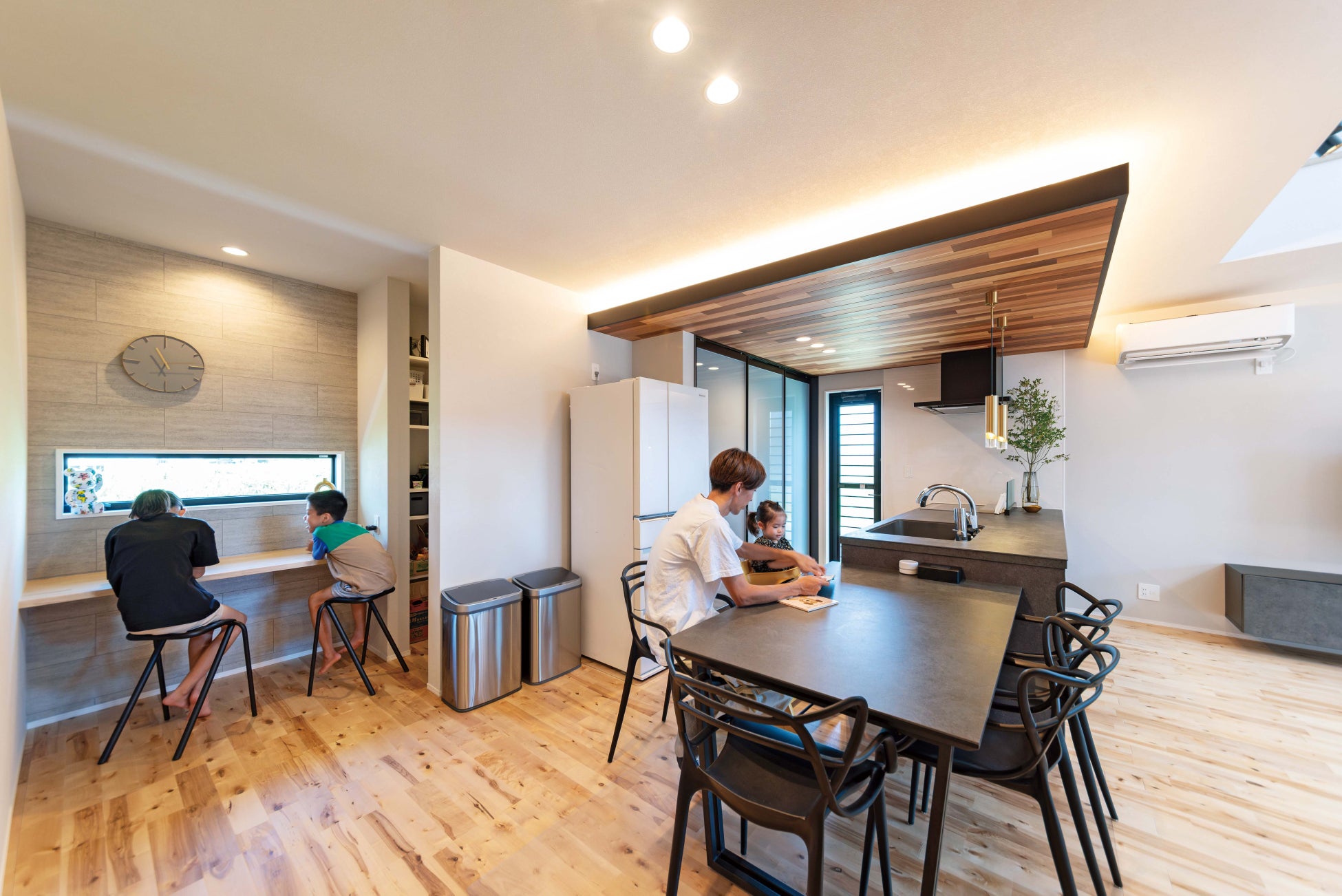 家族それぞれの居場所を大切にしたプランです。ダイニング横のフリースペースや階段下を有効活用したヌック、リビングスペースにあるカウンターなどを利用目的を決めずに設けています。既製品を上手く使いながら造作収納を作り、コストを下げながらも暮らしが充実することを意識しました。水まわりとファミリークローゼットは近くにゾーニングし、洗濯・干す・片付けるができるぐるぐる動線を採用。庭は道路側から外して東側に置き、人目を気にせず家族でゆったりと使える空間になっています。
