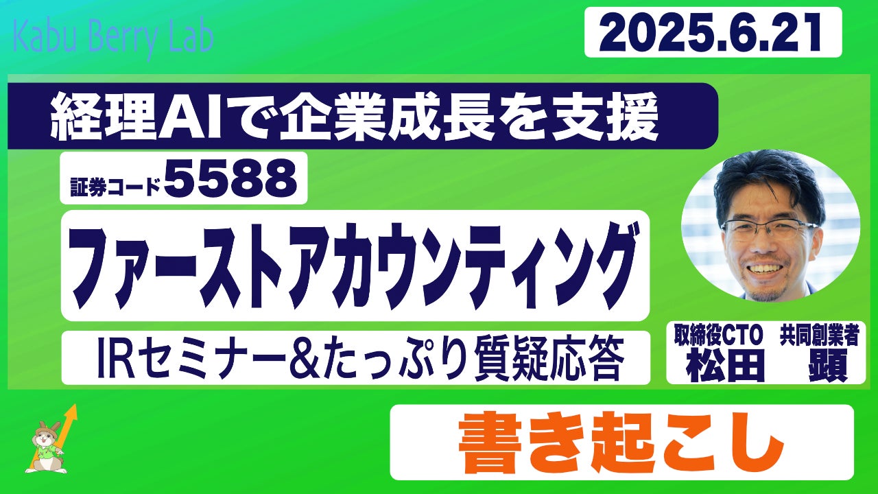 経理シンギュラリティを実現するファーストアカウンティング株式会社(本社:東京都港区、代表取締役社長:森 啓太郎、以下、ファーストアカウンティング)は、2025年6月15日(土)に名古屋で開催された「Kabu Berry主催・個人投資家向けIRセミナー」に登壇し、当社の事業内容や成長戦略に関するIRプレゼンテーションを実施しました。