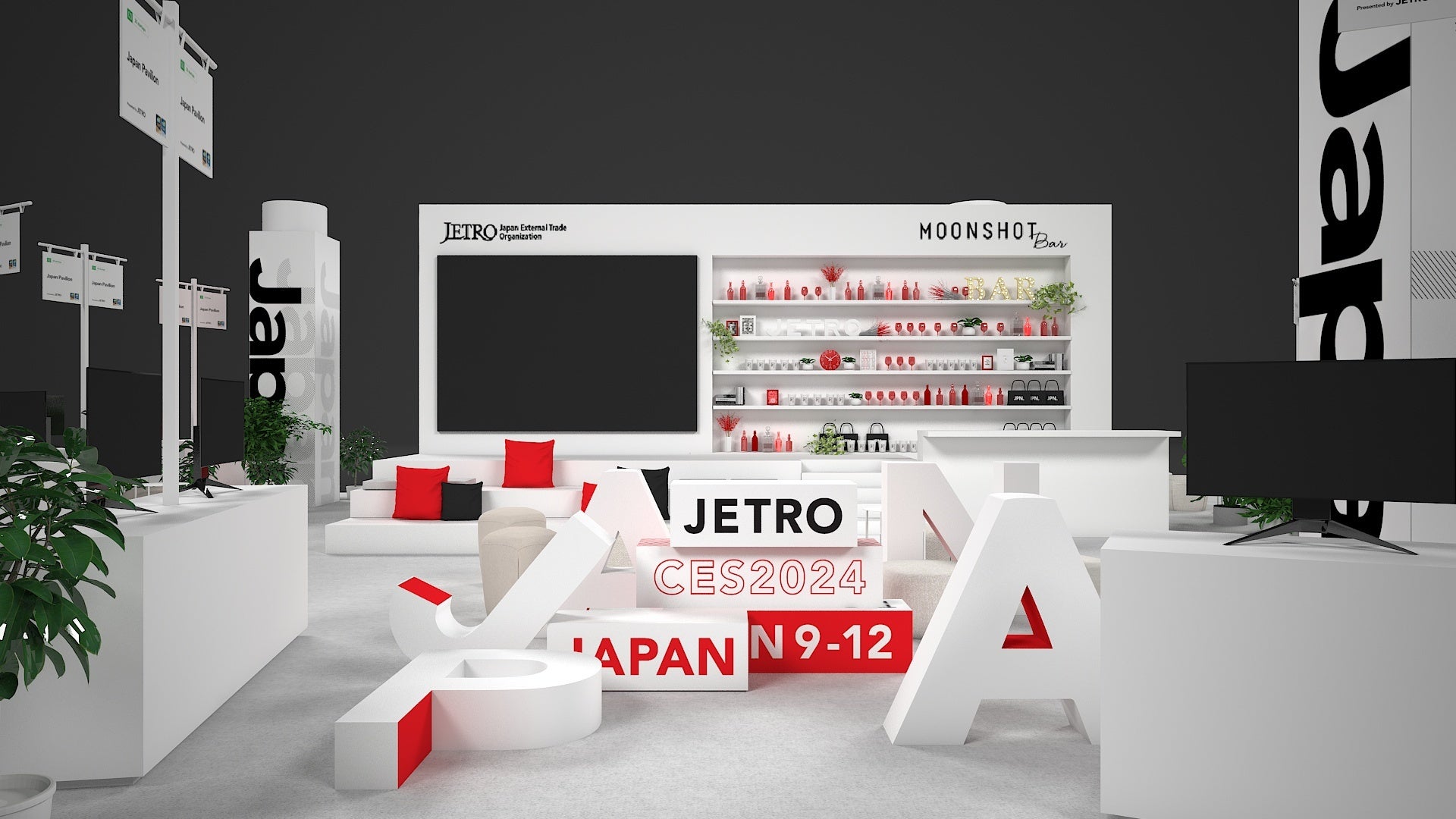 今年のジャパンパビリオンは”Organized Chaos”をテーマに、混とんとした中にも秩序がある計算されたカオスな空間を、白を基調としたミニマリズムのデザインを用いて表現しました。出展スタートアップが世界に羽ばたくことを願って命名したMoonshotBar&Loungeとイベントステージを中央に設置し、来場者と出展者のコミュニケーションの場を設けています。また、来場者と出展企業をつなぐコンシェルジェも配置し、来場者と出展者の交流の機会創出を最大限にサポートします。