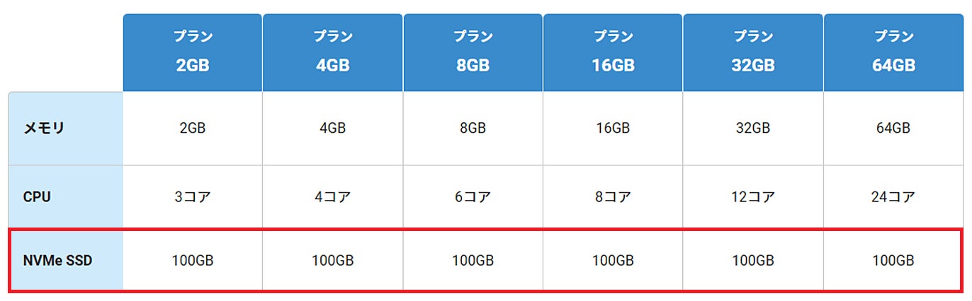従来は4GB~64GBのプランにおいて、一律100GBの容量を提供していましたが、今回の強化によりディスク容量を最大2,400GBまで拡大しました。