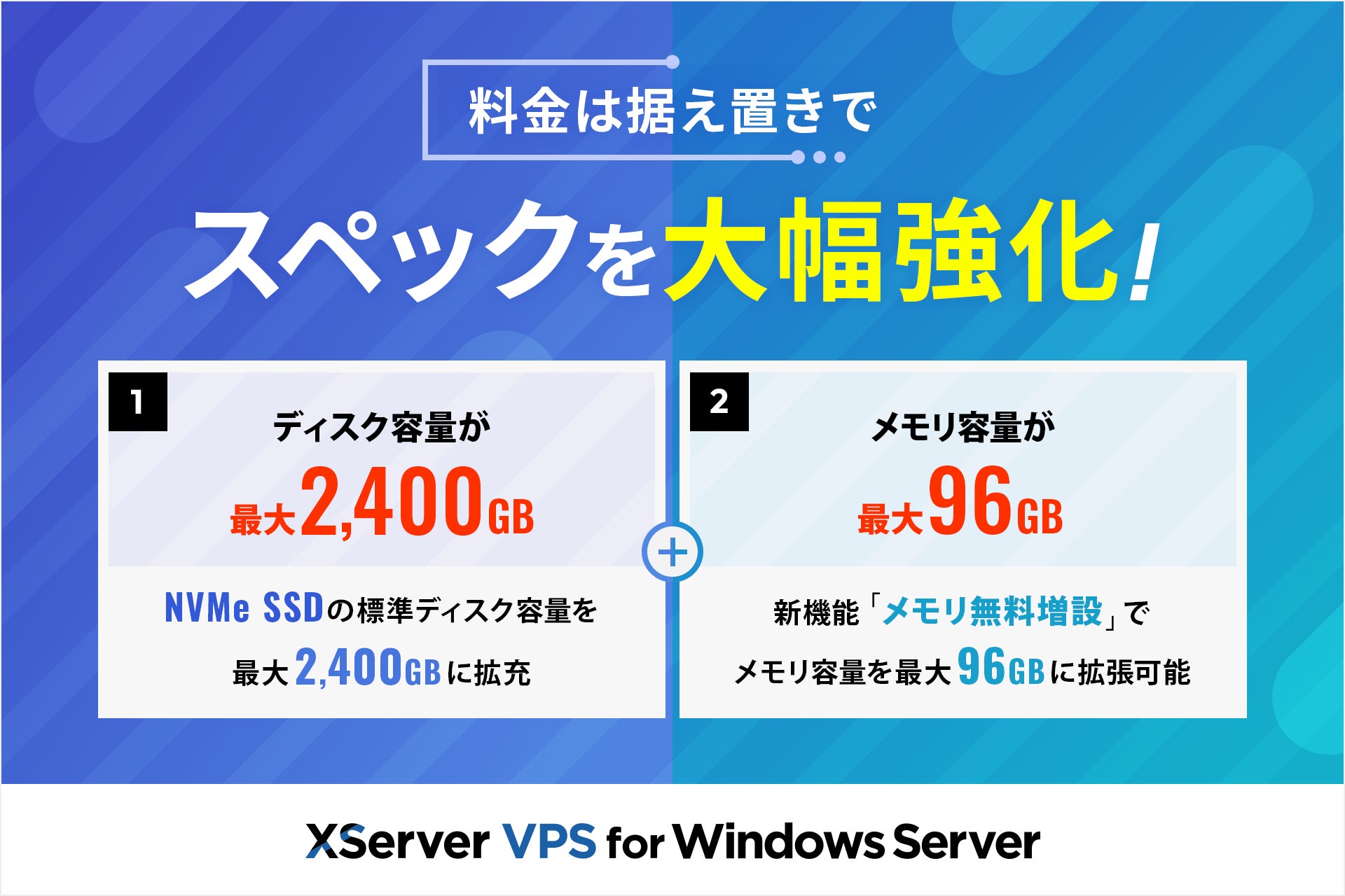 エックスサーバー株式会社(所在地:大阪市北区、代表取締役:小林 尚希)は、2025年2月26日、サーバー性能とコストパフォーマンスでNo.1(※1)を誇る『XServer VPS』において実施した大幅なスペック強化を、Windows搭載プラン『XServer VPS for Windows Server』にも適用しました。今回の強化により、4GBプラン以上で一律100GBだったNVMe SSDのディスク容量を最大2,400GBまで拡大。さらに8GBプラン以上では、メモリ容量を無料で1.5倍に増設できる「メモリ無料増設」機能を新たに追加し、これまで以上に高いスペックが求められる環境や、幅広い用途への対応が可能になりました。なお全プランの料金は据え置きのため、現在『XServer VPS for Windows Server』をご利用中のお客様も、強化後のスペックを現行価格のままご利用いただけます。