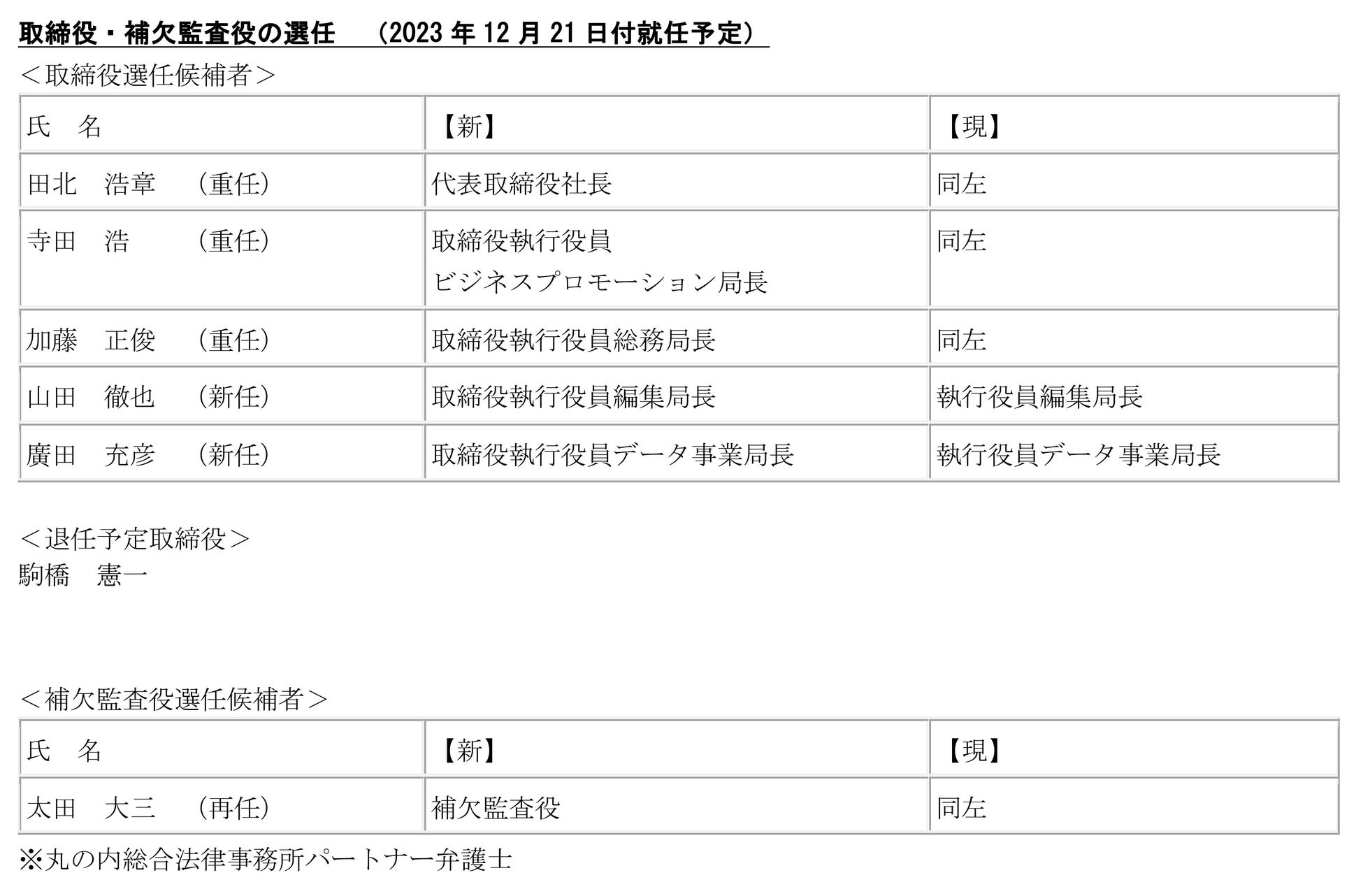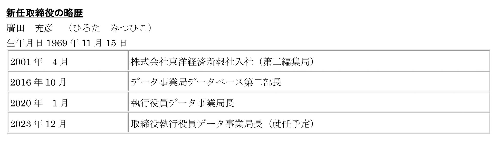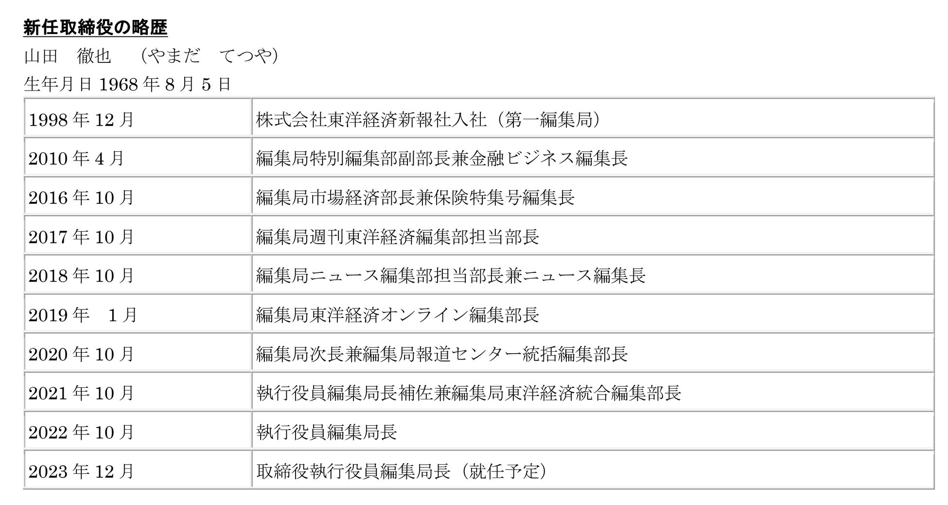 株式会社東洋経済新報社(本社 東京都中央区、代表取締役社長 田北浩章)は、2023年10月31日開催の取締役会において、第132期定時株主総会(2023年12月21日開催予定)に付議する取締役等選任議案の候補について内定いたしましたので、ご報告申し上げます。