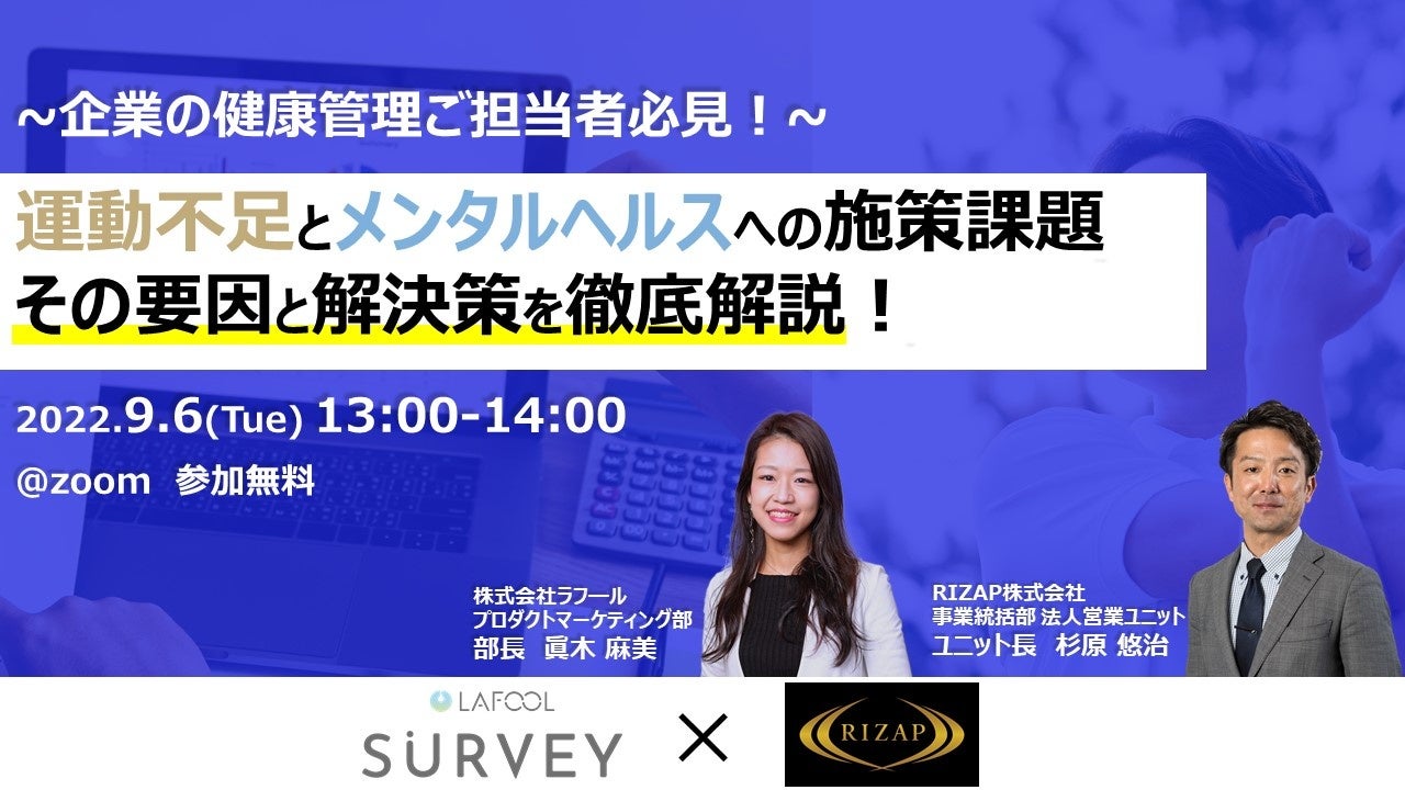 今回は、健康ソリューションを提供するRIZAPとウェルビーイング/人的資本経営支援を行う株式会社ラフ―ルの事業責任者が登壇し、各社が抱える課題とその対策を徹底解説します。