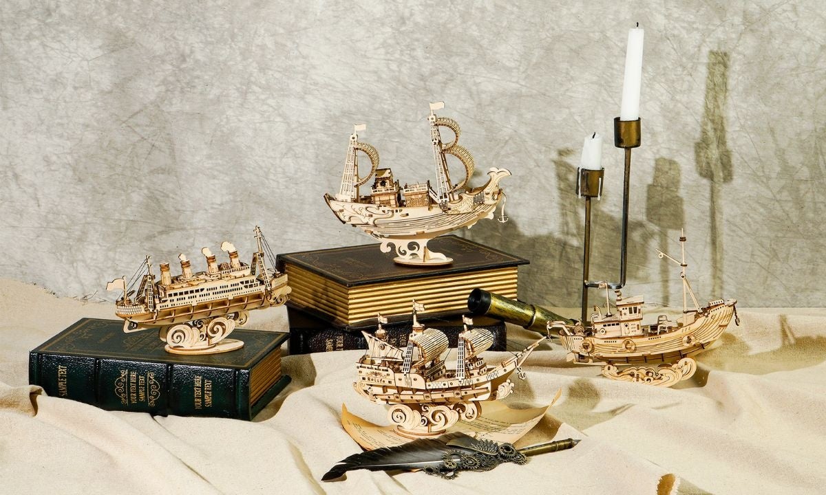 船シリーズは「クルーズ船」「漁船」「帆船」「宝船」の4種。「クルーズ船」はどっしりと重厚感のある雰囲気が特徴的で、「漁船」はウッドパズルの焼きで表現された船体の模様がポイントです。また、「帆船」「宝船」の帆の部分は切り込みの入ったじゃばらパーツで再現されており、それぞれの船ごとに細部までこだわってつくられています。ウッドパズルでありながら模型のような繊細さを持ち合わせているため、つくった後もインテリアとしてお楽しみいただけます。