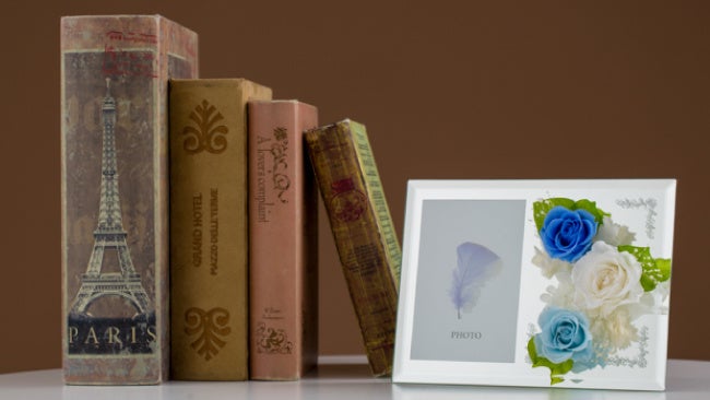 ミラーにバラを添えた、透明感のあるプリザーブドフラワー電報。フォトスタンドとして写真を飾れます。