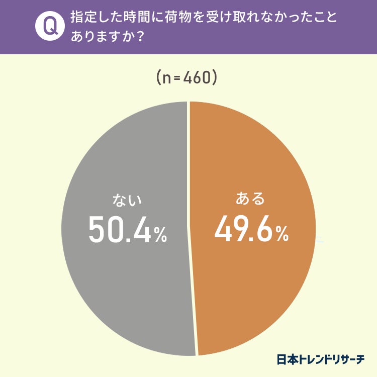 指定した時間に荷物を受け取れなかったことが「ある」方は49.6%でした。