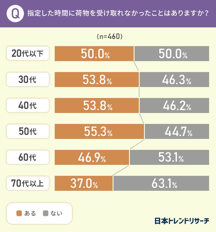 50代以下の半数またはそれ以上の方が、指定した時間に受け取れなかったことが「ある」ようです。