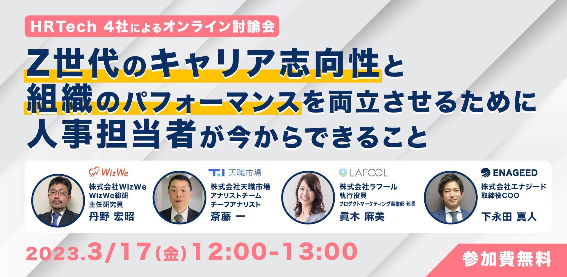 この度、習慣化プラットフォームを開発・運営する株式会社WizWe(ウィズウィー、所在:東京都千代田区、代表取締役CEO:森谷 幸平)は、株式会社エナジード、株式会社天職市場、株式会社ラフールと4社共催で、<HR Tech 4社によるオンライン討論会>Z世代のキャリア志向性と組織のパフォーマンスを両立させるために人事担当者が今からできることを、2023年3月17日(金)に開催いたします。