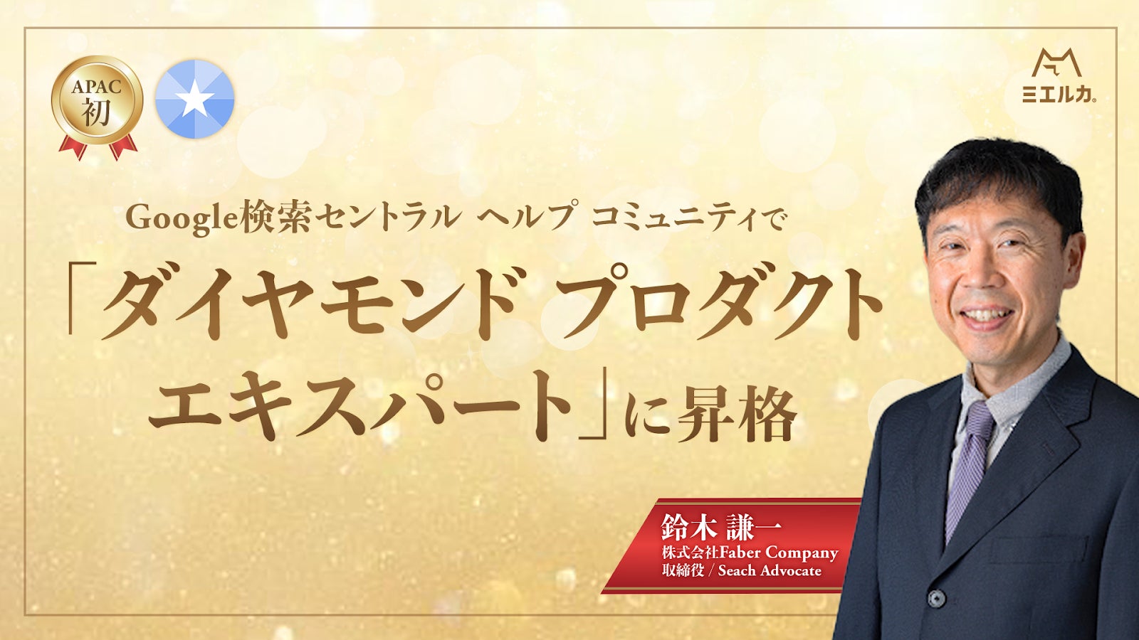 約1,700社のWebマーケティングを支援中の株式会社Faber Company(ファベルカンパニー/本社:東京都港区、代表取締役:稲次正樹・古澤暢央)は同社取締役Search Advocate(サーチ・アドボケイト)鈴木謙一が、2024年1月16日(火)にGoogle検索セントラル ヘルプ コミュニティで「ダイヤモンド プロダクト エキスパート」に昇格したことをお知らせいたします。「ダイヤモンド プロダクト エキスパート」はプロダクト エキスパート プログラム の中で最上位のステータスです。鈴木は、APAC(アジア太平洋)地域でこのタイトルを獲得した初のプロダクト エキスパートになります。