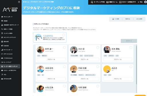 ミエルカSEOの機能「デジタルマーケティングのプロに相談」では、デジタルマーケティングの施策に関して各施策に精通しているプロへ直接相談することが可能です。