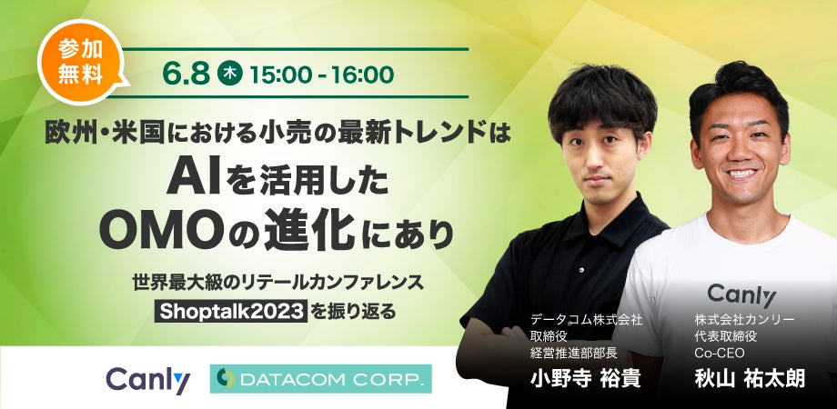 本セミナーでは、株式会社カンリー代表取締役 秋山祐太朗氏・データコム株式会社取締役 小野寺裕貴氏が、Shoptalk 2023(In Europe And In America)の5つのテーマである「最高な顧客とのエンゲージメント」「成長をもたらす新興チャネル」「卓越した店舗体験」「売上・利益を引き上げるためのテクノロジー投資」「生き残るための組織変革」を中心に現地の模様や、発表された最新トレンドについてフィードバックいただきながら欧州と米州の違い、小売業界の未来についてディスカッションしていきます。