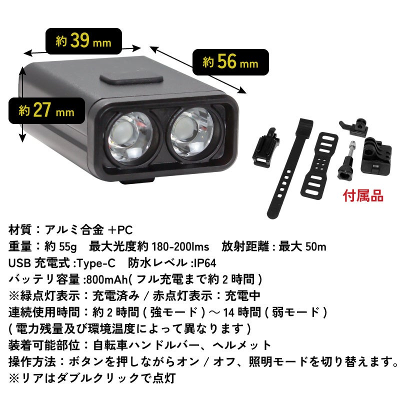 前も後ろも点灯し、付属のブラケットを使えばヘルメットライトとしても使用出来ます。装着も簡単で、工具不要で使用出来ます。USB充電は汎用性の高いタイプCを採用しています。