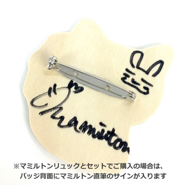 マミルトンが描いたイラスト「マミルニャー」をモチーフにした、オリジナルバッジです。木のぬくもりと、とぼけた表情のニャンコに癒されることまちがいなし!