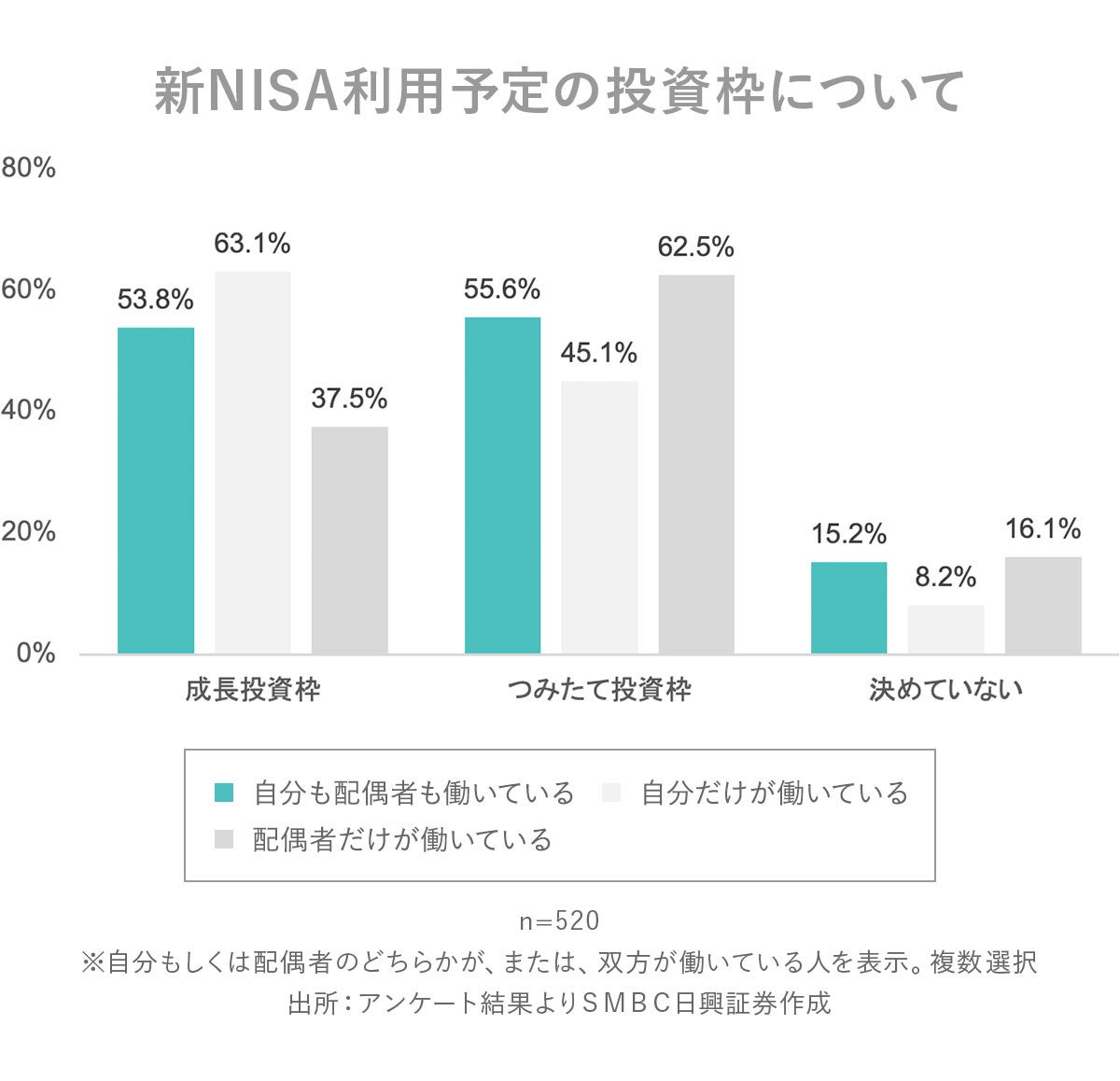 ・「新NISAではどの投資枠をご利用予定ですか。」という問いに対しては、共働き夫婦世帯は成長投資枠が53.8%、つみたて投資枠が55.6%と回答。一方で、「自分だけが働いている」方は、成長投資枠が多く、「配偶者だけが働いている」方は、つみたて投資枠が多い結果に。