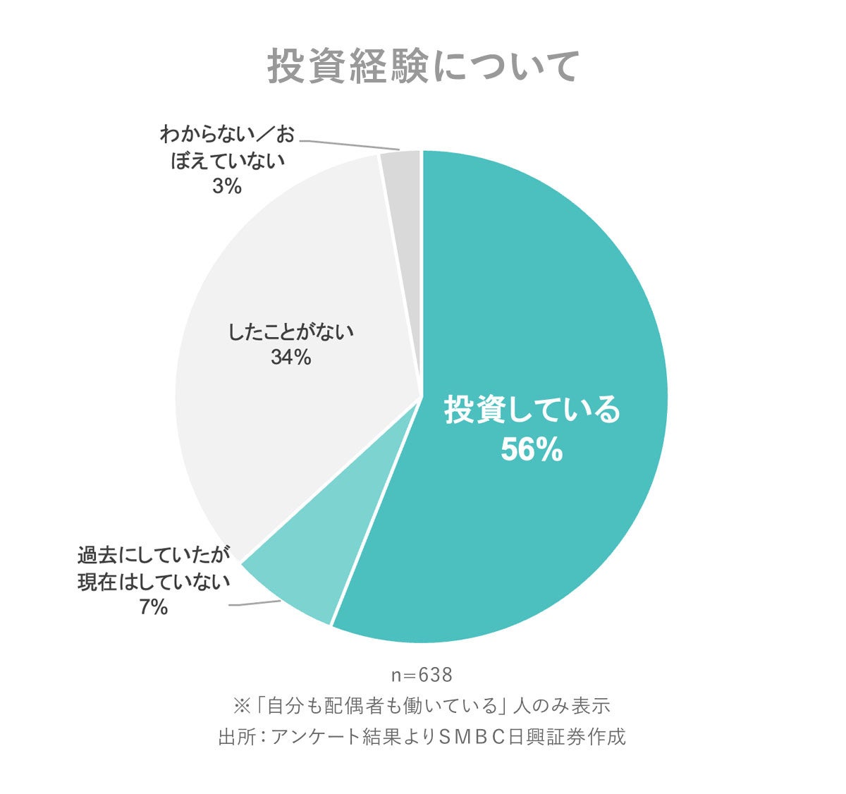 ・「あなたは現在、投資や資産運用をしていますか。」という問いに対しては、56%の人が「投資している」と答えた。一方で、3人に1人はまだ投資を「したことがない」と答えており、そのハードルの高さなどから一歩を踏み出せていない様子もうかがえた。