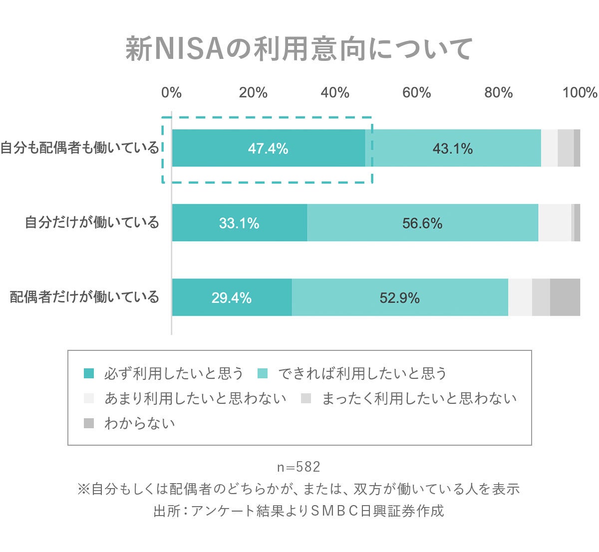 ・「新NISAを利用したいと思いますか」という問いに対して、「必ず利用したいと思う」と答えたのは47%にも上り、片働き世帯(自分だけが働いている:33%、配偶者だけが働いている:29%)よりも意向が強い様子がうかがえた。