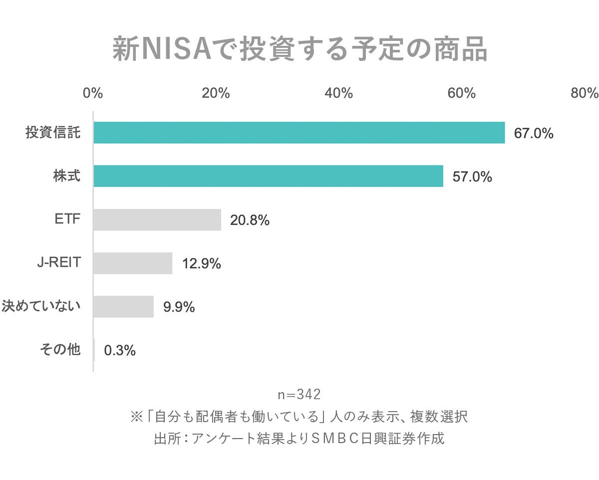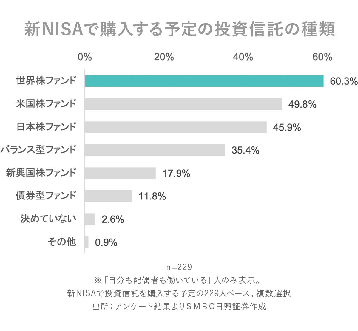 ・新NISAで投資する予定の商品についてお伺いしたところ、過半数の方が「投資信託」「株式」と回答。また、投資信託に投資する予定の方にどんな投資信託を選ぶ予定かをお伺いしたところ、6割の方が「世界株ファンド」と回答。次いで「米国株ファンド」「日本株ファンド」。