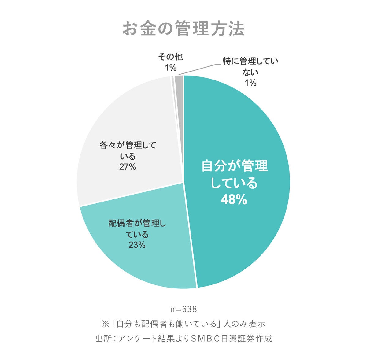 ・既婚者(男女1106名)のうち、共働き夫婦世帯は638名。その共働き夫婦にお金の管理についてうかがったところ、「自分または配偶者が管理している」と答えた人は455人(71%)。