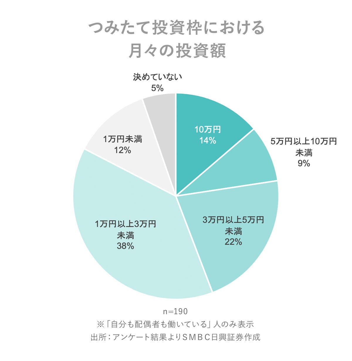 ・つみたて投資枠を利用する予定の方に、「毎月いくらずつ投資する予定ですか。」とお伺いしたところ、共働き夫婦世帯では「1万円以上3万円未満」という回答が38%で最多に。また、最大の10万円と回答した方も14%おり、新NISAをフル活用したいという層も。
