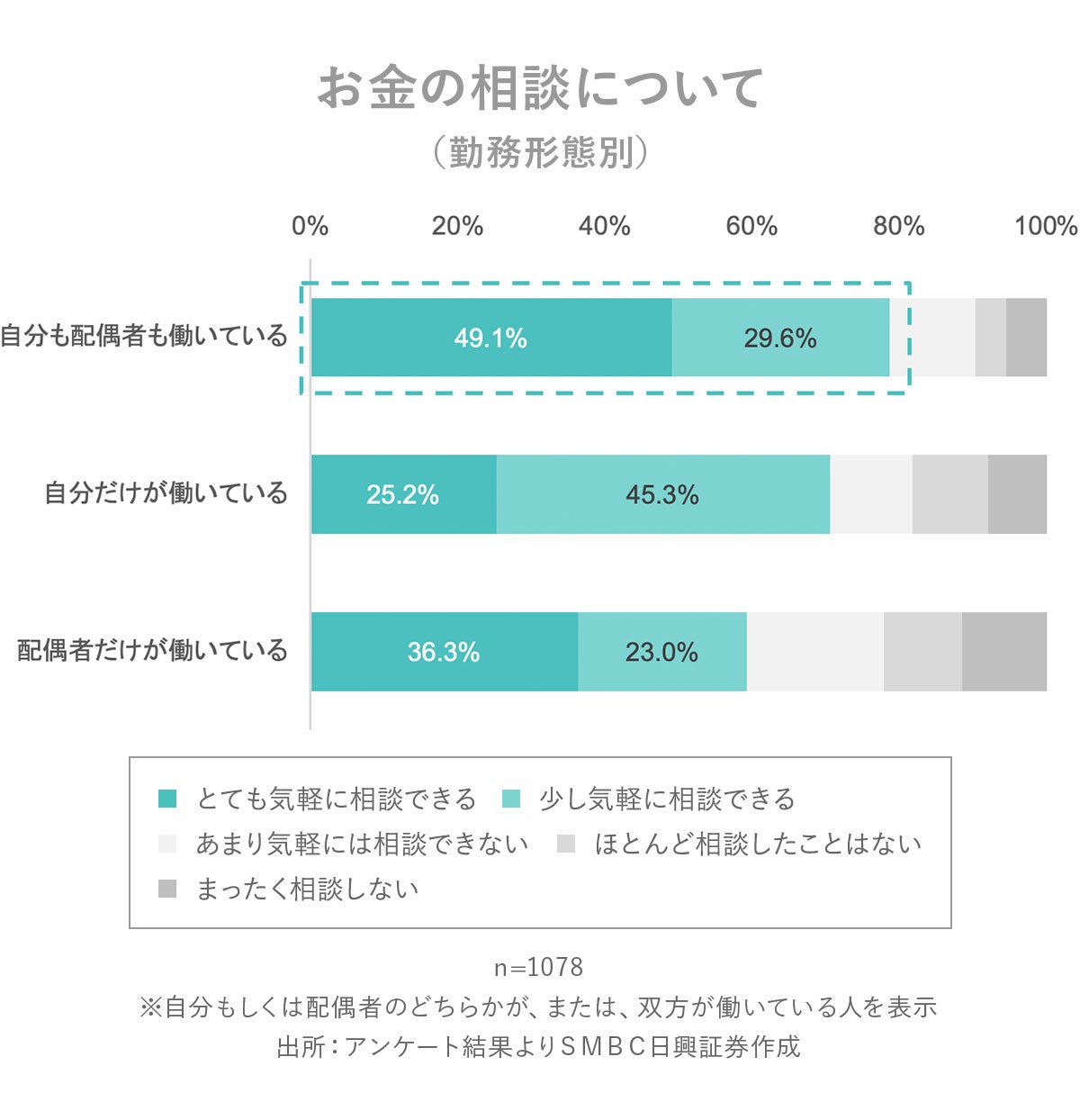 ・「夫婦でお金の管理や資産運用について気軽に相談できますか。」という問いに対して、313名(49%)の方が「とても気軽に相談できる」と回答。片働きなどほかの就労状態の家庭と比べると、お互いに働いて収入を支えあっていることなどから、相談しやすい環境が整っていると思われる。