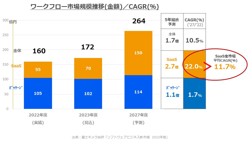 富士キメラ総研によると、2022年度(実績)のワークフロー市場規模(金額)は全体160.6億円、その内パッケージ市場が105.0億円、SaaS市場が55.6憶円であることが分かりました。そして2022年度(実績)から2027年度(予測)にかけてCAGR(年平均成長率)もSaaS市場が大きく牽引して引き続き右肩上がりで成長していくと予測されています。さらに、48品目で構成される全SaaS市場の2022年度(実績)から2027年度(予測)にかけてのCAGRが11.7%なのに対してSaaSワークフロー市場のCAGRは22.0%と大きく上回っており、他の市場と比較してもSaaSワークフロー市場の成長性はとりわけ今後も高く推移することが見込まれます。