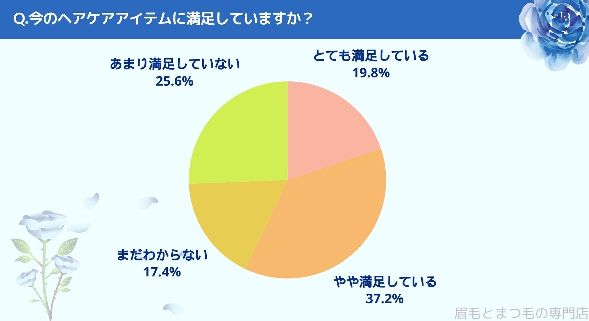今のヘアケアアイテムに満足しているかお聞きしたところ「とても満足している(19.8%)」、「やや満足している(37.2%)」、「まだわからない(17.4%)」、「あまり満足していない(25.6%)」という結果になりました。