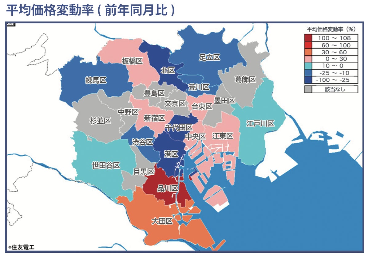 東京23区の平均価格・平均坪単価・平均面積・供給戸数を前年同月値と共に表にまとめ、平均価格の前年同月比で平均価格変動率を算出、ポリゴン表示しました。